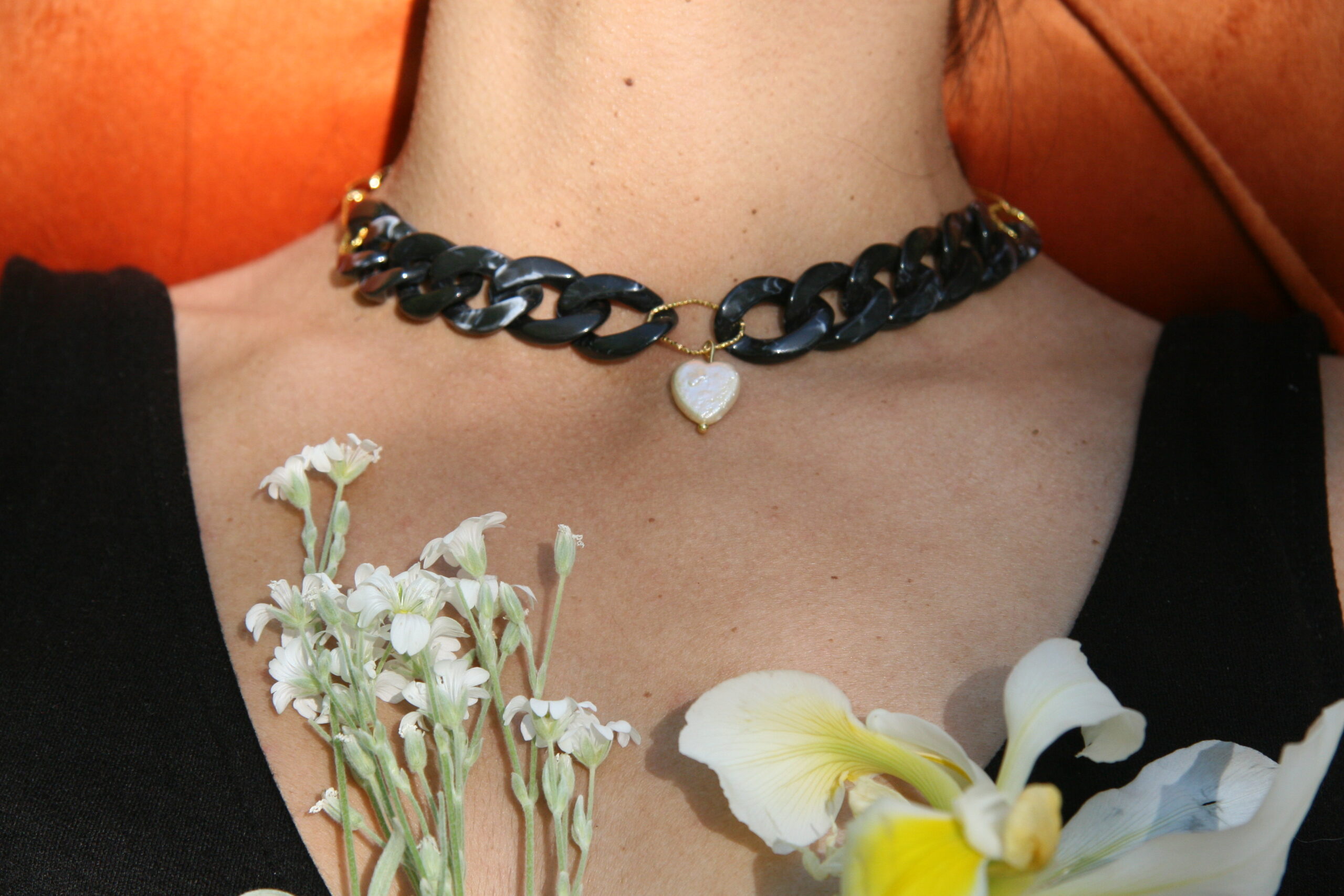 Collier ras de cou maillons en acrylique de couleur, perle d’eau douce en forme de cœur & chaîne en acier inoxydable